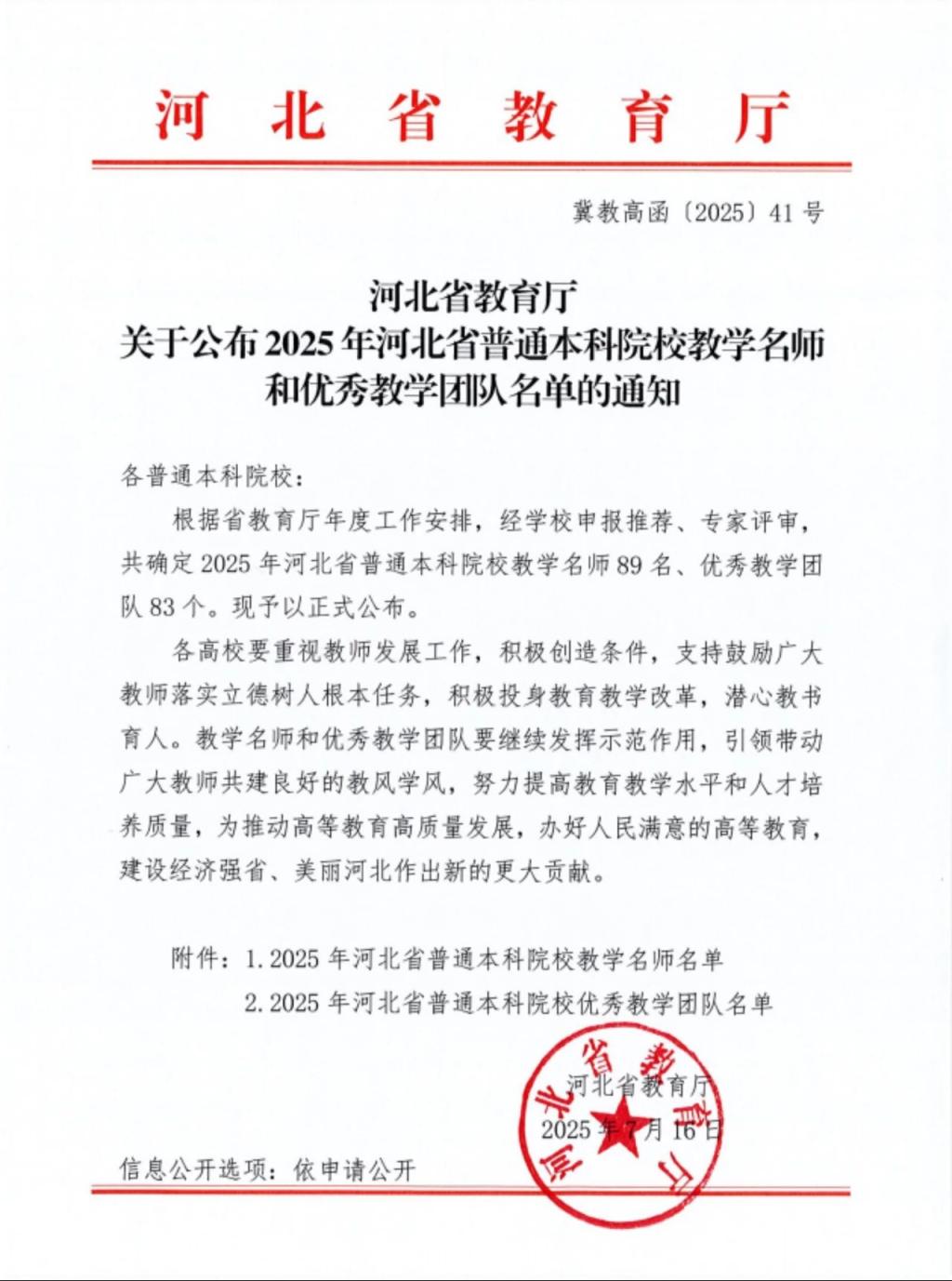 近日,河北省教育厅下发《关于公布2025年河北省普通本科院校教学名师和优秀教学团队名单的通知》(冀高教函〔2025〕41号)文件,经彩金赌博 推荐、学校专家评审推荐和省教育厅评选,彩金赌博(中国)唯一官方网站 投资学教学团队凭借扎实的教学实力、鲜明的教学特色及突出的育人成效,成功入选2025年河北省普通本科院校优秀教学团队。